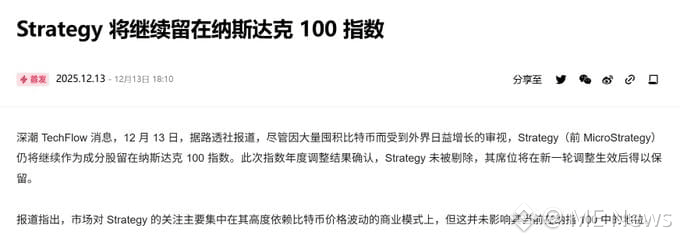 本周五,纳斯达克 100 指数宣布保留 Strategy 的成分股地位。