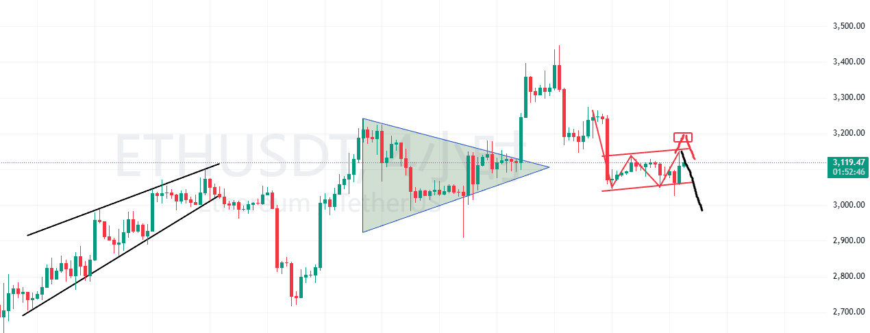 目前ETH虽然表现相对坚挺,但整体仍处于下跌趋势中。当前形成的形态看似矩形整理,但我认为更可能是看跌旗型。如果是后者,短期反弹后大概率会继续下跌。