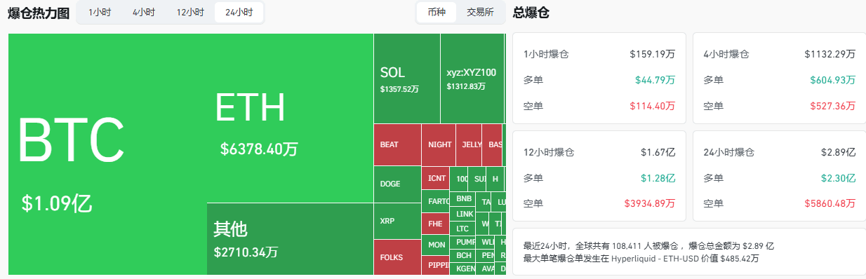 过去24小时内,加密货币市场再次上演惊险行情,全球共有108,411人遭遇爆仓,爆仓总金额高达2.89亿美元。在经历本周的剧烈洗盘后,市场进入关键观察期。