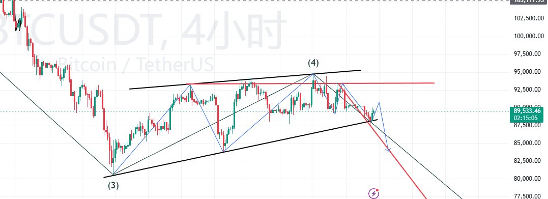 比特币目前走势符合此前看跌预期,已跌破8.9-9万美元支撑区并下探至8.7万美元附近。从形态来看,价格仍处于上升楔形结构,这通常被视为看跌信号。