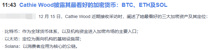 "Bull Market Queen" Cathie Wood publicly names SOL, listing her top three favorite cryptocurrencies as: BTC, ETH, SOL. She defines SOL as a "consumer-centric chain," making it clear that SOL is not just for show; it aims to achieve real results!