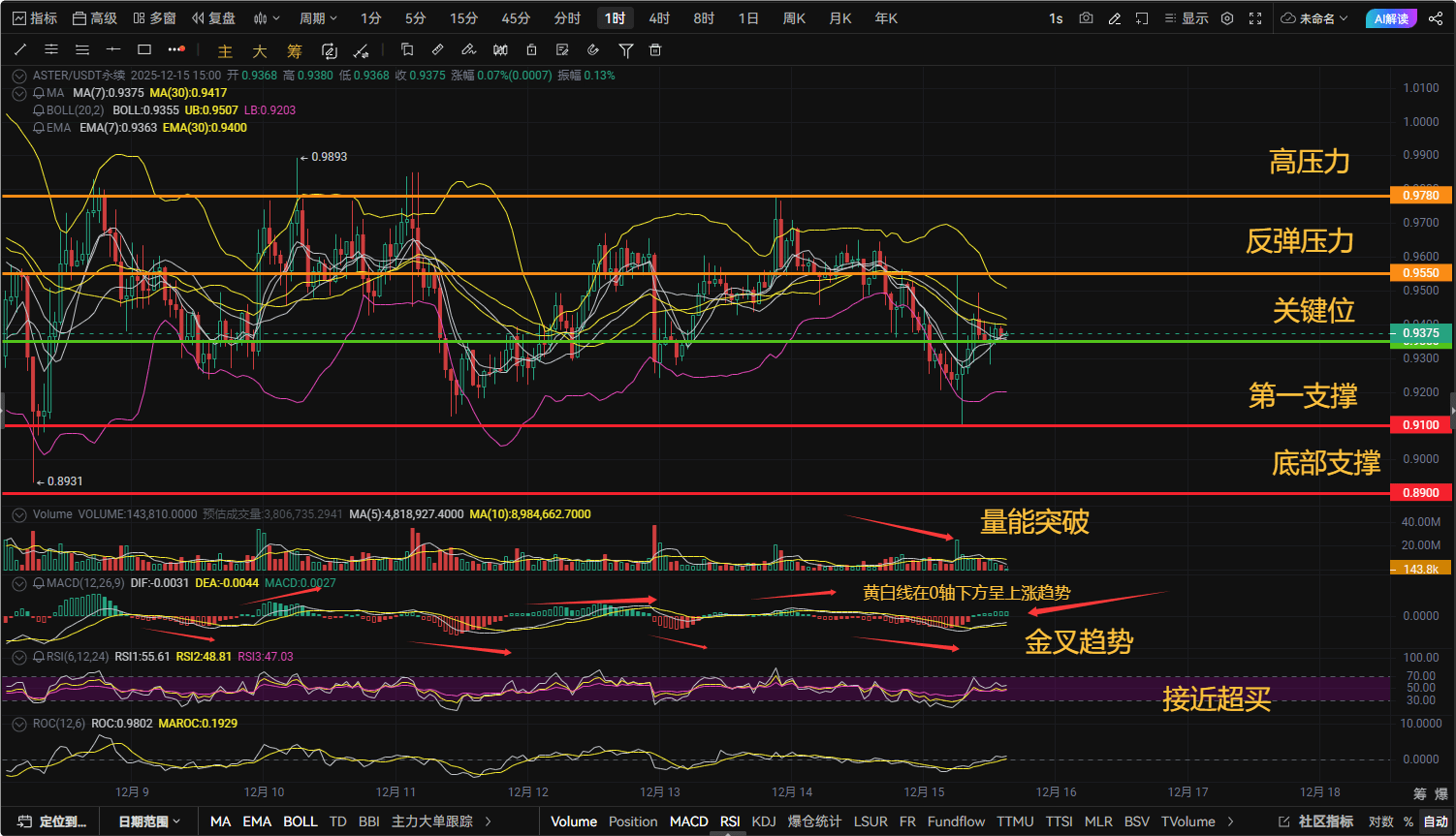 With CZ's news stimuli, market sentiment is high, and in the morning, it directly surged to test, breaking through 0.955 is possible. However, when encountering the previous high point pressure at 0.978 for the first time, it is highly likely to face strong selling pressure.
