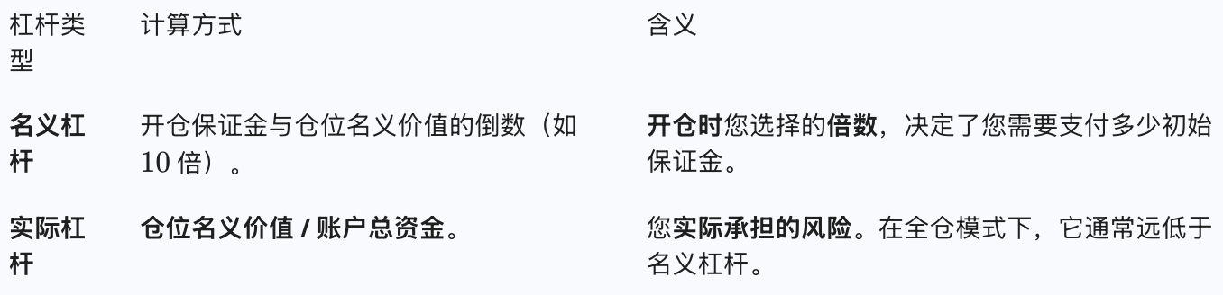 For example: Full position, the contract account has $1000, using $100 to open with 10x nominal leverage (position $1000). The actual leverage is 1000/1000 = 1x.