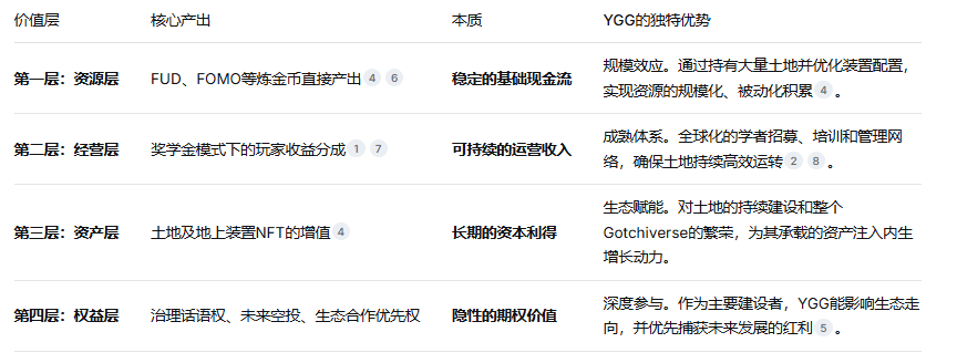 How does YGG extract value from a piece of virtual land that exceeds tenfold or a hundredfold rent? The answer lies in a sophisticated four-layer alchemy model.