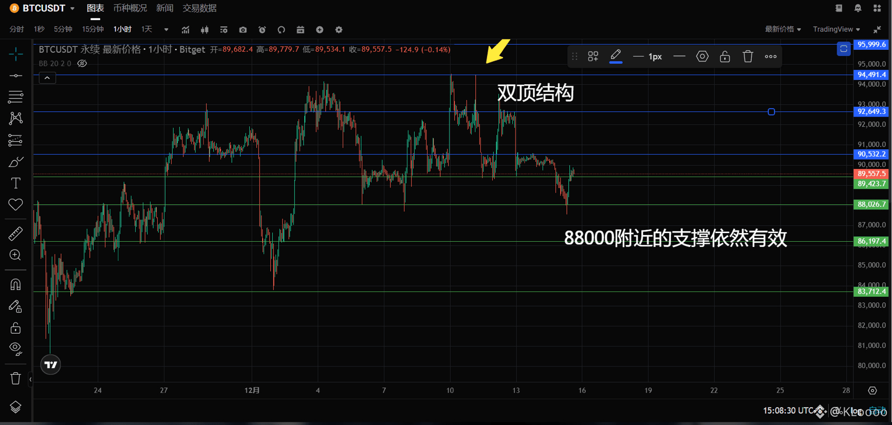 大饼今日上方阻力 90500 92700 附近,下方支撑 87500 86100附近