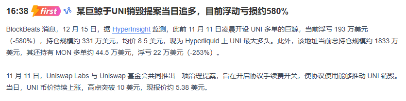 Let me tell you something: there was a whale who rushed into a long position on the day UNI announced it would burn transaction fees in November, and now he has an unrealized loss of nearly 580%, losing almost 2 million dollars... Can you say that's not scary?