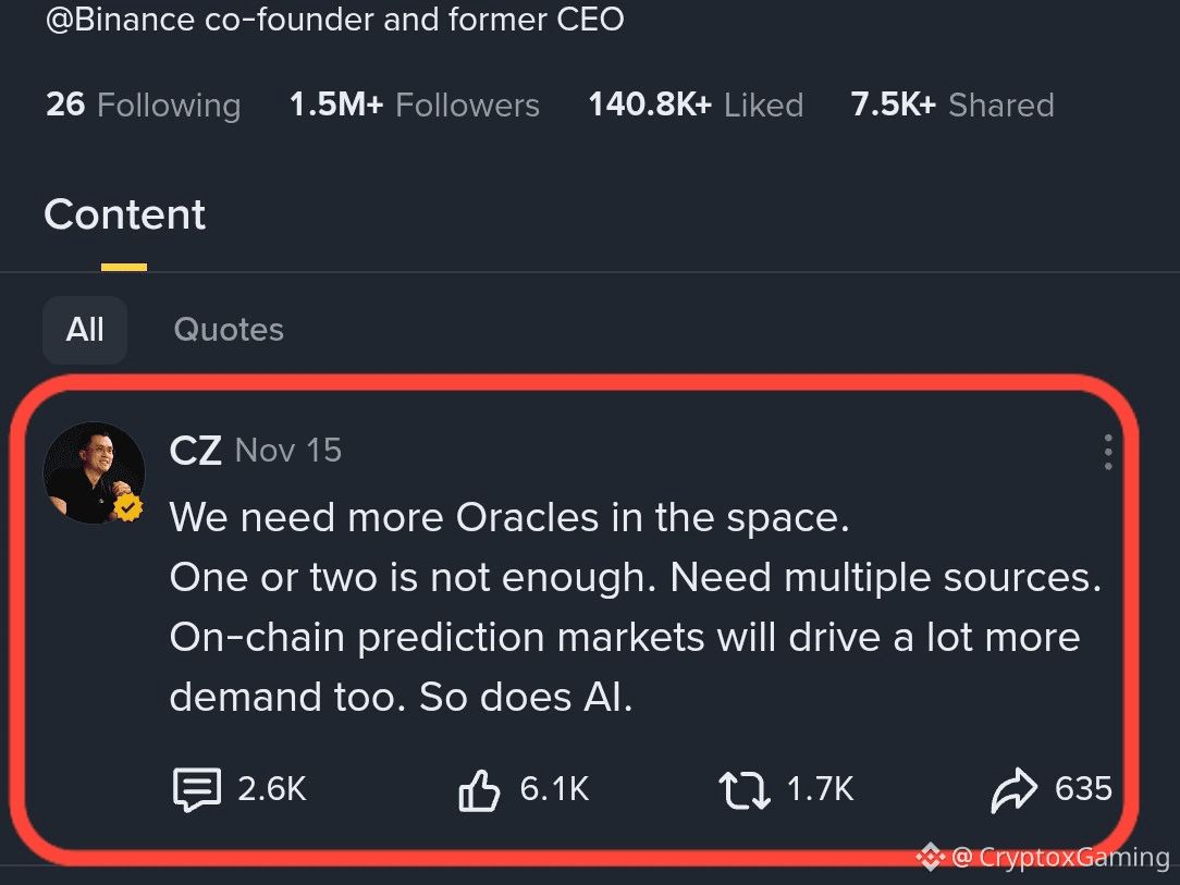 On Nov 15, CZ called for an increase in oracles within the crypto ecosystem. As retail interest continues to grow, he highlighted the need for additional oracle solutions to support prediction markets.