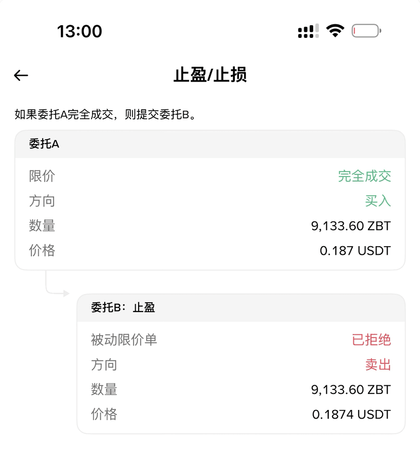 This initially confused and infuriated me 😡. After some investigation, I discovered the reason: after a limit order is placed, a 0.1% ZBT fee is deducted as a transaction fee, causing the take-profit order to "think that you haven't sold enough quantity" and reject it, preventing the automatic sale from proceeding.