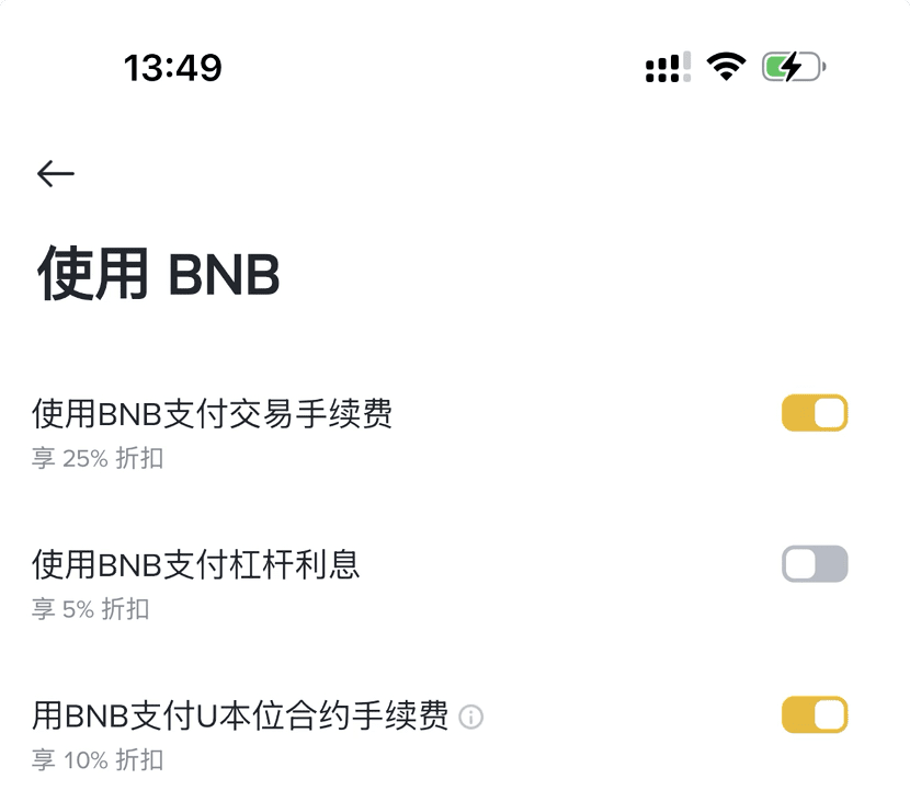 Important Reminder: To use BNB as a transaction fee payment, the BNB must be held in your spot trading account (or in your futures trading account if it's a futures contract). If you hold it in your wealth management account, you will not receive this benefit. Additionally, you must enable the BNB discount switch in the app settings.