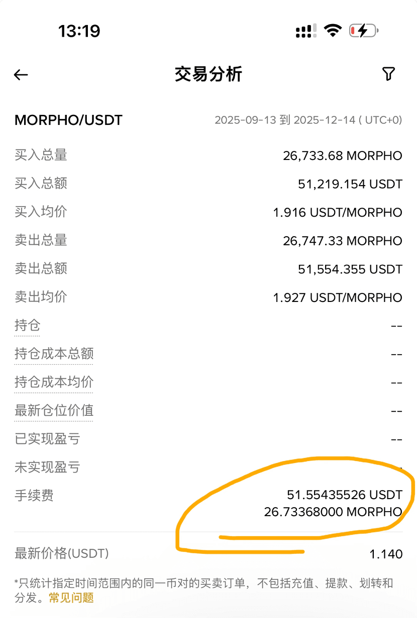 In fact, after deducting transaction fees, I made a total profit of 73 USDT from participating in Morpheo's spot trading competition. However, the transaction fees alone amounted to 100 USDT. If I had used the BNB discount, I could have saved up to 25 USDT, enough for several large meals.