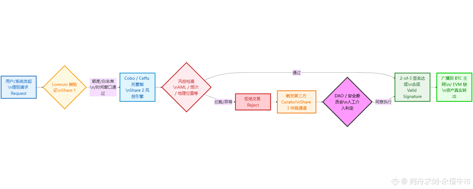 Lorenzo 没有用简单的链上多签,而是直接上了 企业级 MPC-TSS 架构,由 Cobo 等托管机构提供底层能力。
