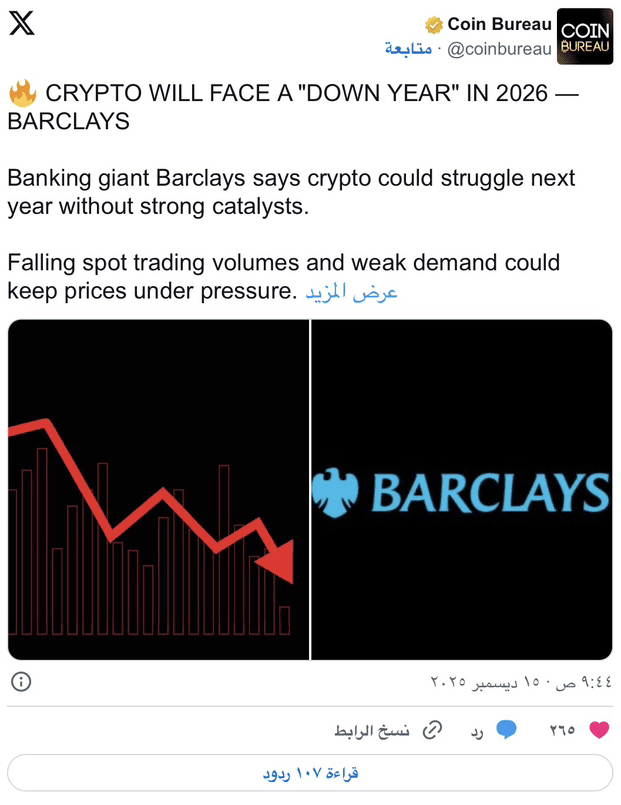 Barclays has delivered a cautious message to digital asset investors as the new year approaches. The global banking giant sees cryptocurrency markets potentially facing difficulties in 2026 without strong catalysts to re-ignite momentum. Analysts point to weak activity and declining enthusiasm as key warning signs.