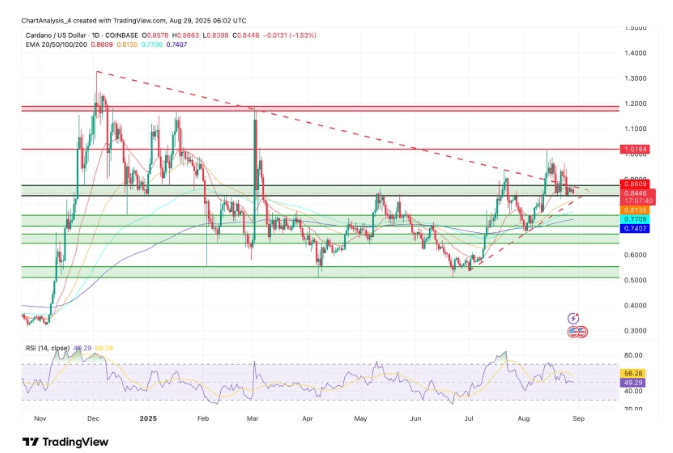 ✨ Cardano's price remains locked in a trading range with ADA hovering near the mid $0.80 zone according to daily chart analysis. The cryptocurrency follows a scientific, research-based blockchain development model that puts security and sustainability first. Recent candles show ADA consolidating above clustered moving averages, suggesting a pause rather than any major directional shift.