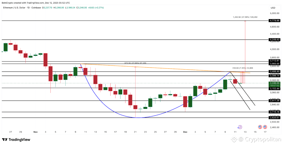 The resistance levels are still stacked on top. Crossing the barrier of $3,486 effectively creates a way to reach intermediate levels, which are close to $3,712 and $4,249, with a targeted price that is approximately $4,779. On the other hand, a failure to maintain a bullish structure may result in ETH being vulnerable to further declines, especially with a break below $3,152 or even making the entire pattern invalid when below $2,620.