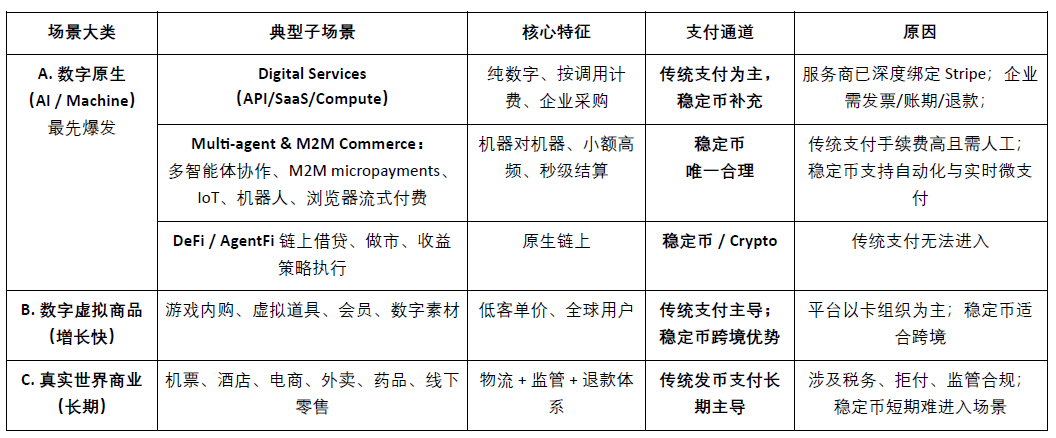 The core barrier to the scalability of stablecoins in real-world commerce is not just technology but regulation (KYC/AML, taxation, consumer protection), merchant accounting (illegal repayment of stablecoins), and the lack of dispute resolution mechanisms brought by irreversible payments. Due to these structural constraints, stablecoins will find it difficult to enter highly regulated industries such as healthcare, aviation, e-commerce, government, and utilities in the short term, with their implementation mainly focusing on low-regulation or on-chain native scenarios, such as digital content, cross-border payments, Web3 native services, and machine economy (M2M/IoT/Agent) — which is precisely where the first opportunities for large-scale breakthroughs in Web3 native agent commerce lie.