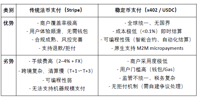 In the Agentic Commerce system, the real-world merchant network represents the greatest value scenario. Regardless of how AI Agents evolve, the traditional fiat payment system (Stripe, Visa, Mastercard, bank transfers) and the rapidly growing stablecoin system (USDC, x402) will coexist for a long time, together forming the foundation of Agentic Commerce.