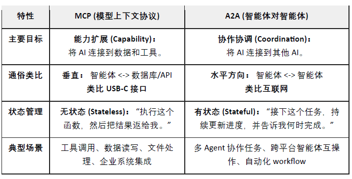A2A addresses 'how Agents collaborate with other Agents'—establishing native communication standards for cross-vendor and cross-framework agents, supporting multi-turn dialogue, task decomposition, state management, and long-life cycle execution, serving as the basic interoperability layer between agents.