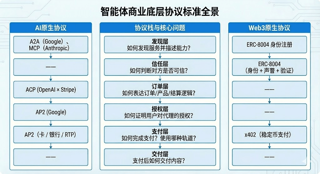 The protocol stack of Agentic Commerce consists of six layers, forming a complete machine commercial link from 'capability discovery' to 'payment delivery.' The A2A Catalog and MCP Registry are responsible for capability discovery, ERC-8004 provides on-chain verifiable identity and reputation; ACP and AP2 undertake structured ordering and authorization instructions, respectively; the payment layer consists of traditional fiat tracks (AP2) and stablecoin tracks (x402) operating in parallel; the delivery layer currently lacks a unified standard.