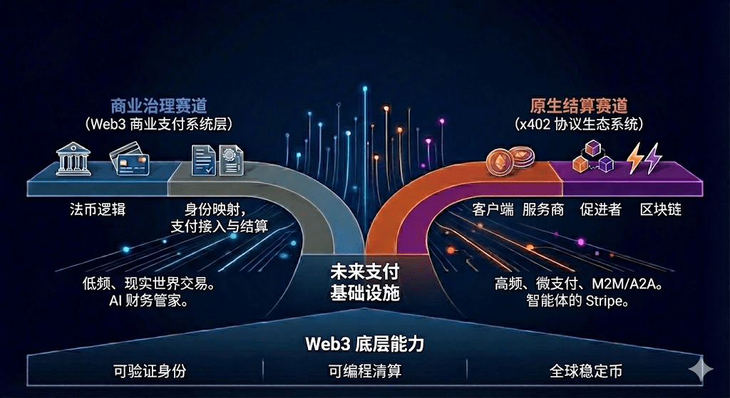 Along this evolutionary path, future payment infrastructure will diverge into two parallel tracks: one based on traditional fiat logic for business governance, and the other based on the x402 protocol for native settlement. The value capture logic between these two is different.