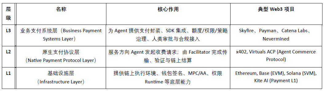 The business payment system layer (L3) includes projects such as Skyfire, Payman, Catena Labs, and Nevermined, providing payment encapsulation, SDK integration, limits and permission governance, human approval, and compliance access, interfacing with traditional financial tracks (banks, card organizations, PSPs, KYC/KYB) to varying degrees, building a bridge between payment businesses and the machine economy.