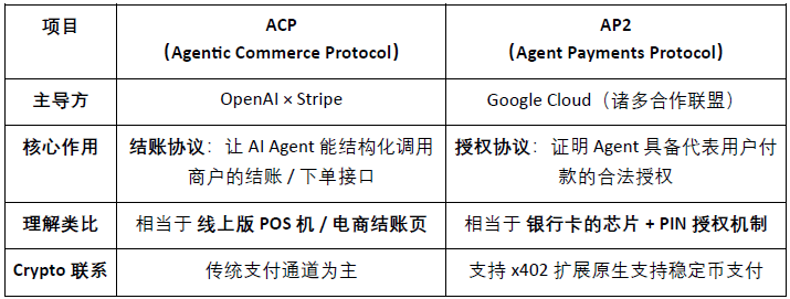 AP2 is designed with 'Payment-Agnostic' principles, supporting credit cards, bank transfers, real-time payments, and stablecoin access through x402 and others. In the entire Agentic Commerce protocol stack, AP2 does not handle specific product and ordering details, but provides a universal Agent payment authorization framework for various payment channels.