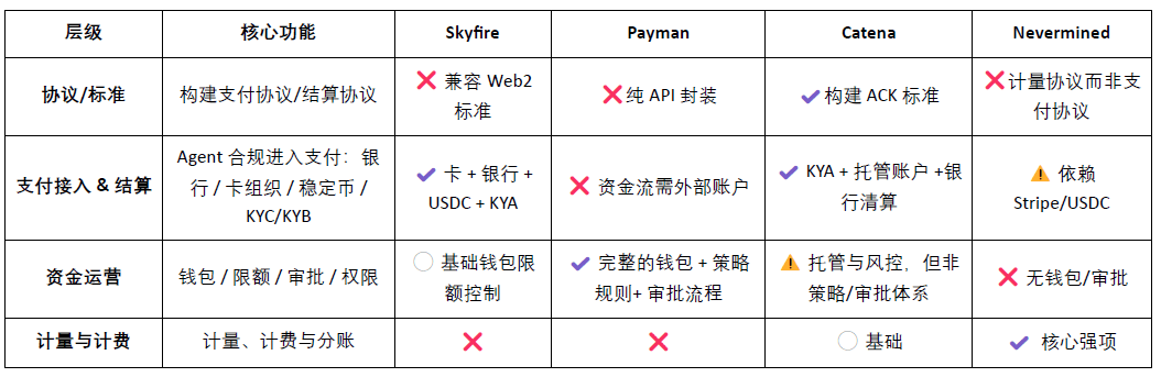 Skyfire, Payman, Catena Labs, and Nevermined belong to the business payment layer, all needing to interface with banks, card organizations, PSPs, and KYC/KYB to varying degrees, but their true value lies not in 'accessing fiat' but in addressing the machine-native demands that traditional finance cannot cover—identity mapping, permission governance, programmatic risk control, and per-call billing.
