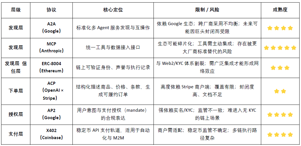 Based on the introduction of the core protocol stack of Agentic Commerce, the table below summarizes the positioning, core capabilities, major limitations, and maturity assessments of the protocols at each level, providing a clear structured perspective for building a cross-platform, executable, and payable agent economy.