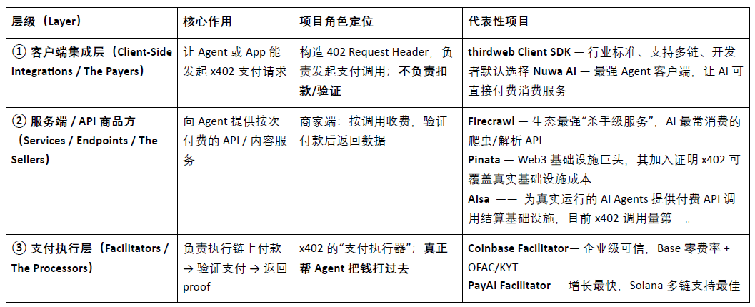 Client-side integration layer (Client-Side Integrations / The Payers): Allows Agents or applications to initiate x402 payment requests, serving as the 'starting point' for the entire payment process. Representative projects: