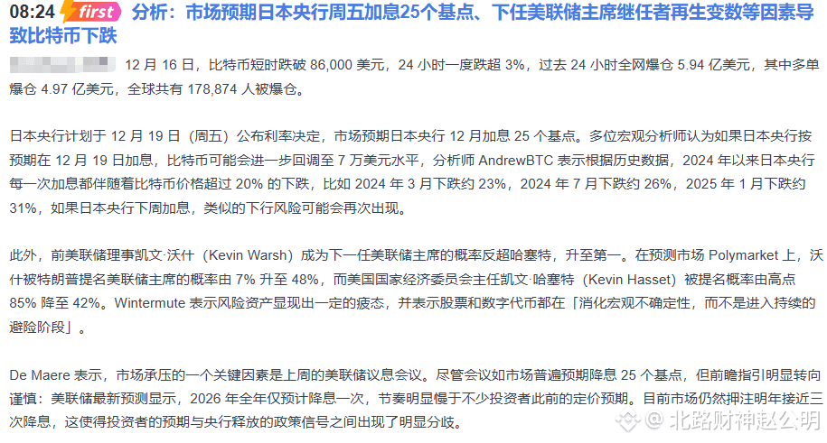 暴跌的根源在于全球宏观叙事的重磅转向。市场几乎笃定日本央行将于本周五加息25个基点,而历史数据触目惊心:2024年以来,日本央行每一次加息都伴随着比特币超过20%的暴跌。