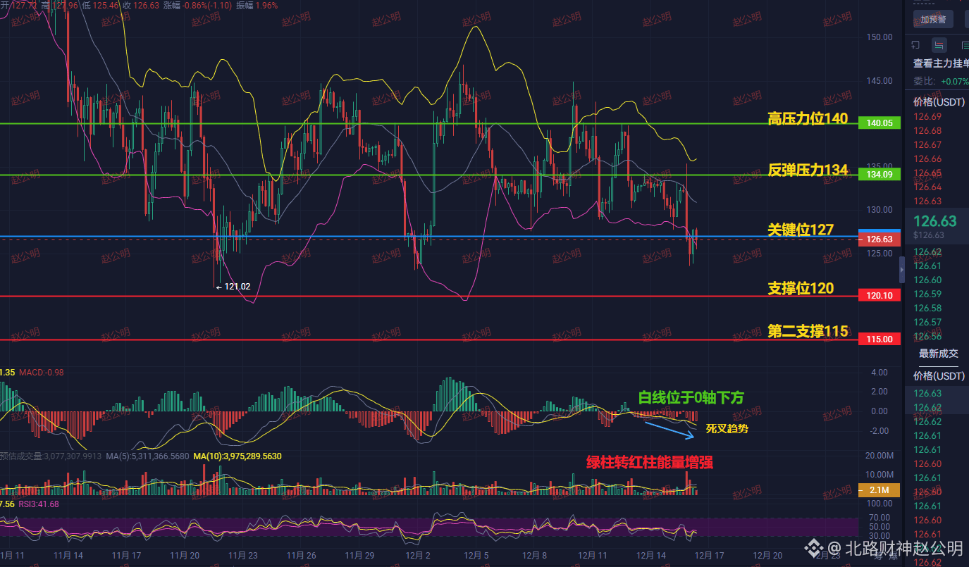 四小时K线图已呈现崩坏态势。价格被死死压制在140强压力位下方,关键的127支撑位岌岌可危。MACD死叉趋势明确,且绿柱转红柱,下跌能量显著增强,这是空头加速的信号。