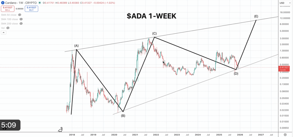 The guy is not throwing darts; he is using a framework called wave analysis and is focusing on something he calls a triangular structure on the chart. Imagine that the price of ADA is moving within a funnel that is closing (the correction), and we are waiting for the last leg of that movement, the "wave E", before it bursts upward. 🚀