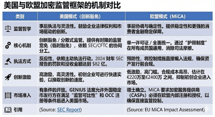 The shift in U.S. regulation is also participating in a global regulatory competition. The flexibility represented by its 'Innovation Exemption' and categorical regulatory model stands in stark contrast to the unified, pre-authorization model represented by the EU's (Crypto Assets Market Act) (MiCA).