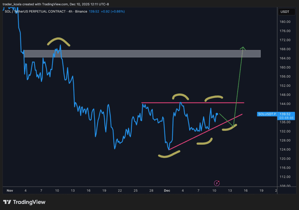 SOL forms a rising triangle structure with higher lows and steady resistance, indicating growing pressure as traders track the tightly compressed price range.