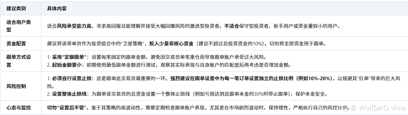 暂停信号:出现以下情况立即暂停跟单:连续 3 笔交易亏损;单笔亏损超自身跟单本金的 15%;带单员收益率单日回撤超 20%。