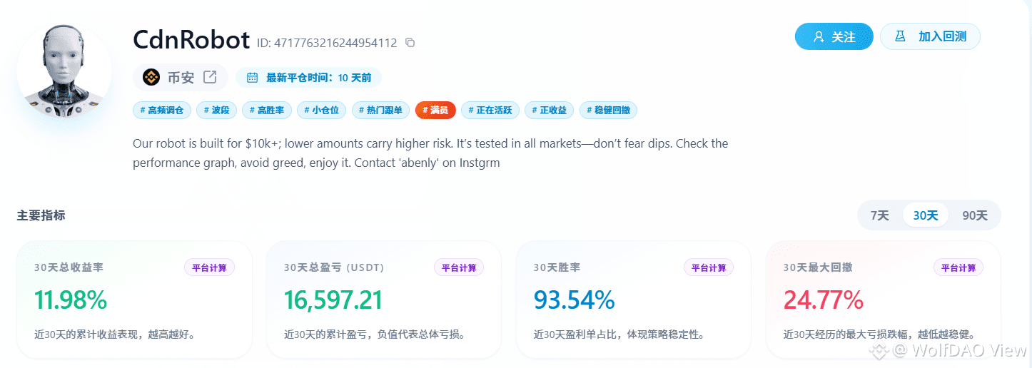 带单员 “CdnRobot” 的高频量化策略,以高胜率、高收益、高跟单盈利比例成为带单圈焦点,但核心矛盾在于 “高胜率与低盈亏比” 的失衡,暗藏大幅回撤、滑点、系统故障等多重风险。