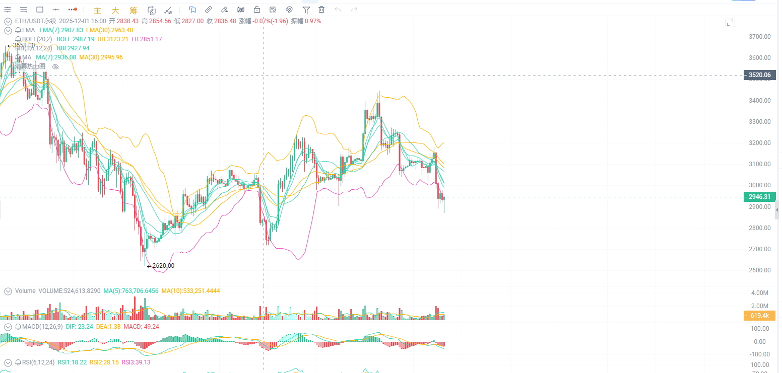 Let's take another look at the technicals. Looking at the ETH one-hour candlestick chart, it seems to be rising, but those in the know understand that one cannot just look at the surface. Now, looking at the MACD indicator below, the white line and yellow line are stuck together below the zero axis, forming a 'death cross'. What does this mean? This is a rebound in a downtrend, lacking significant strength. The upper level of 3150 is like an insurmountable high wall, pressing down hard. The lower level of 3000 is a key psychological support level; if it breaks again, the support level at 2890 will be in danger.