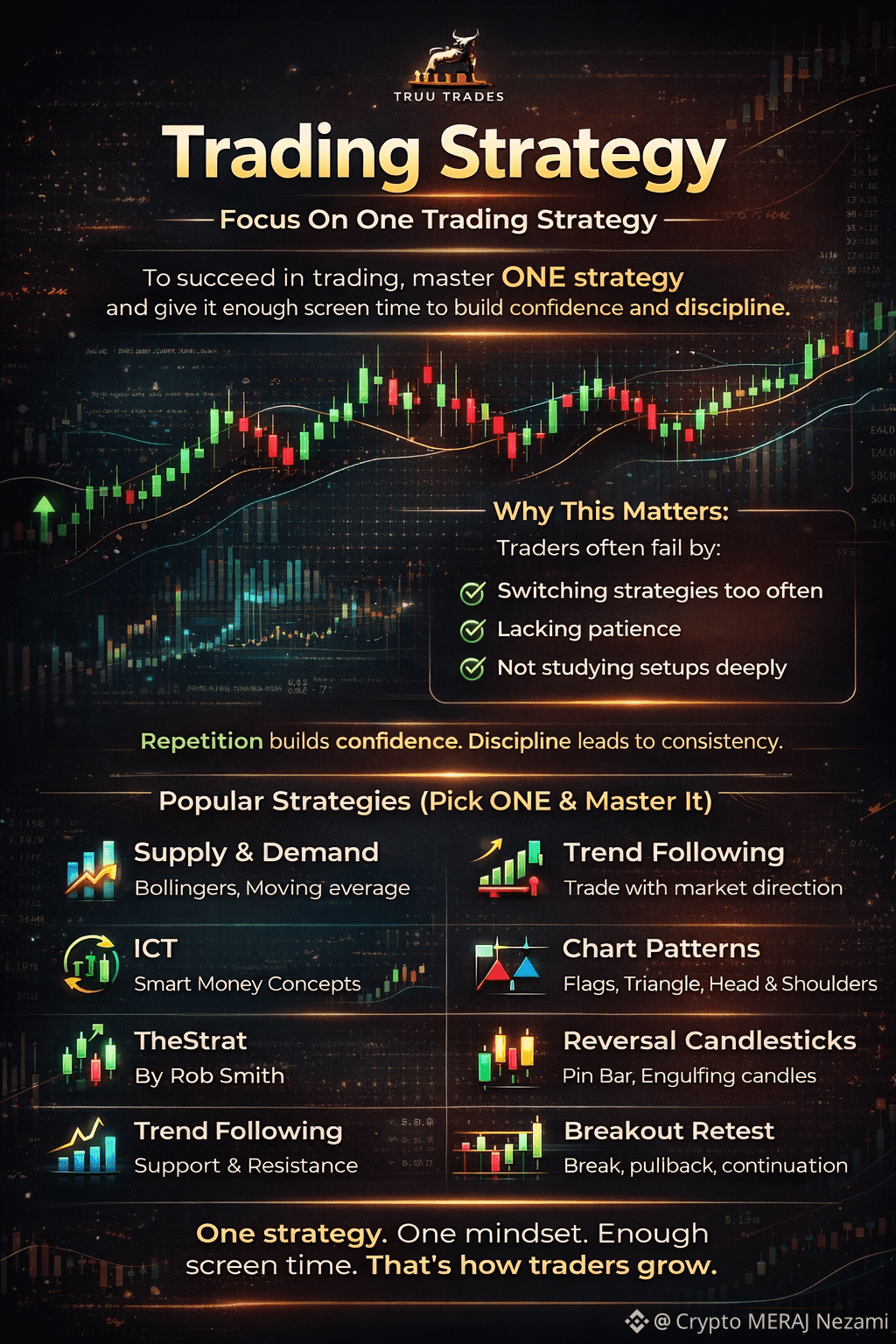 Popular strategies bahut saari hain—jaise Supply & Demand, Trend Following, Chart Patterns, ya Reversal Candlesticks. Lekin aapko sirf ek choose karke usi par focus karna hai.