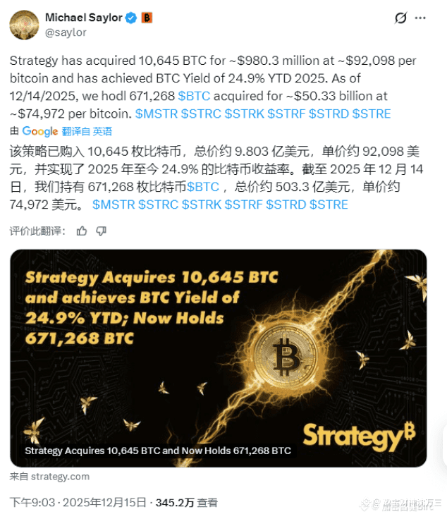 链上数据也印证这点:现在主要是短期持有者在抛,高位套牢的散户抛压很小。微策略上周又买了10645枚BTC,价值9.8亿美元,累计持仓67万枚,连续两周扫货超1万枚,这操作够硬气!ETH方面微策略也增持了10万枚,成本均价3906美元,现在浮亏30亿,但人家敢加仓说明长期看好。