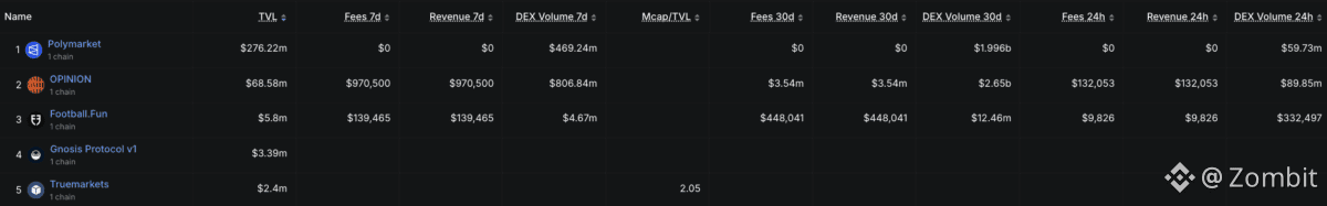 同樣獲得 YZi Labs 支持的預測市場平台 Opinion 已於今年 10 月正式在 BNB Chain 上線,並迅速累積資金規模。由於其產品推進速度與生態資源支持力度,Opinion 在社群中一度被戲稱為「幣安親兒子」。根據 DefiLlama 數據顯示,Opinion 目前的總鎖定價值(TVL)約為 6,800 萬美元,在預測市場類別中僅次於 Polymarket。