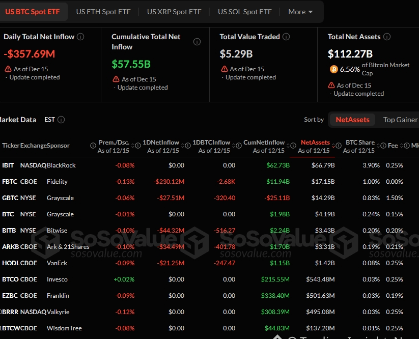 15/12 marks a gloomy trading day for Spot Bitcoin ETF, as capital flows have sharply shifted into negative territory.