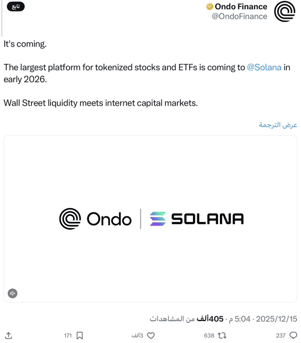 Ondo Finance announced on its X account on Monday that it plans to integrate with Solana in early 2026, bringing its leading platform for tokenized stocks and ETFs to the network.
