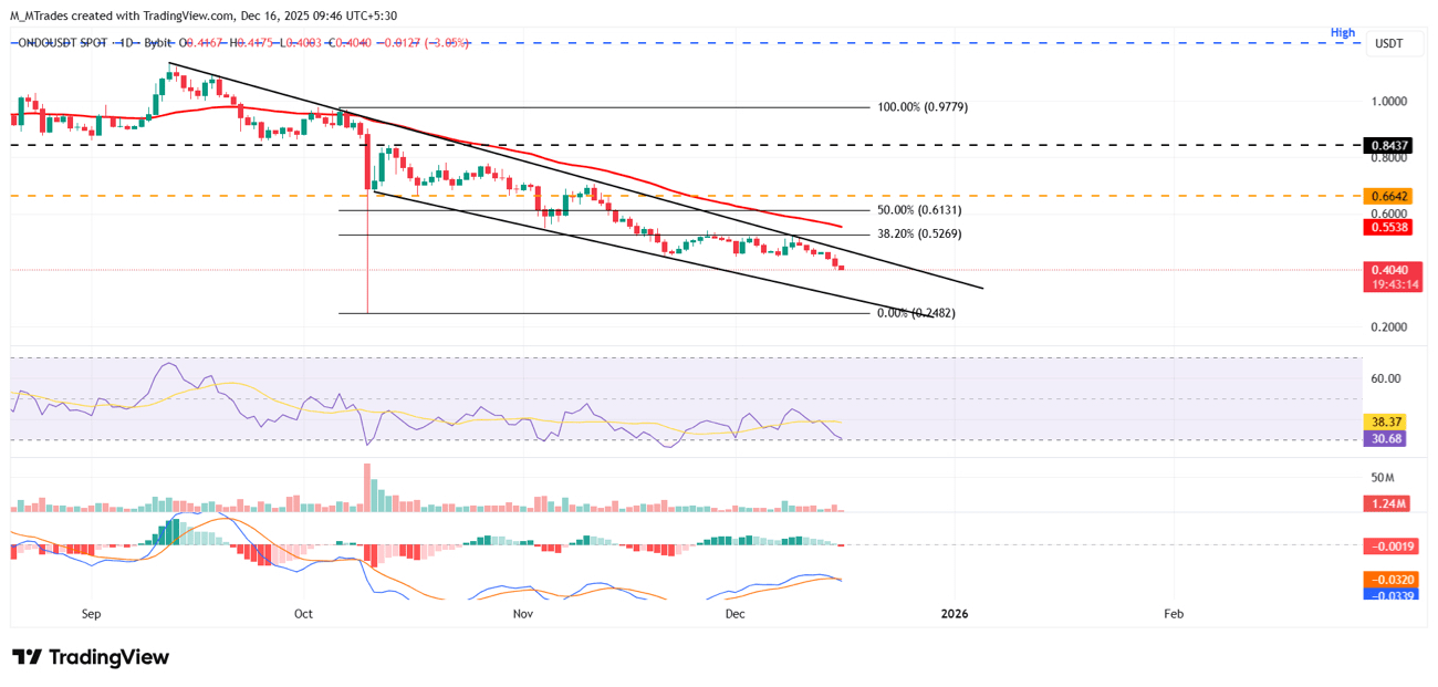 The price of Ondo ($ONDO ) continues to correct, trading below $0.40 at the time of writing this report on Tuesday after a 6% drop the previous day. Ondo Finance announced on Monday that it plans to integrate with Solana (SOL) in early 2026 to expand its platform for tokenized stocks and ETFs, highlighting a long-term bullish outlook. However, short-term price action and derivatives indicate further declines, supported by weak momentum and waning trader conviction.
