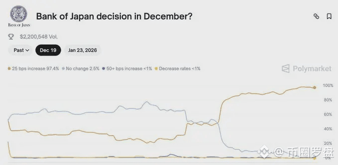 12月19日,日本银行将举行一次关键政策会议,普遍预计将加息25个基点。即使是预测平台Polymarket,目前也显示12月19日加息的概率为98%。