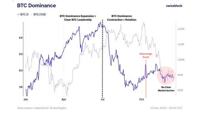 Every recovery attempt following the deleveraging events faded quickly, indicating a lack of conviction. The result is a market lacking a strong secondary leader, with Bitcoin remaining the anchor by default, not solely due to strength.