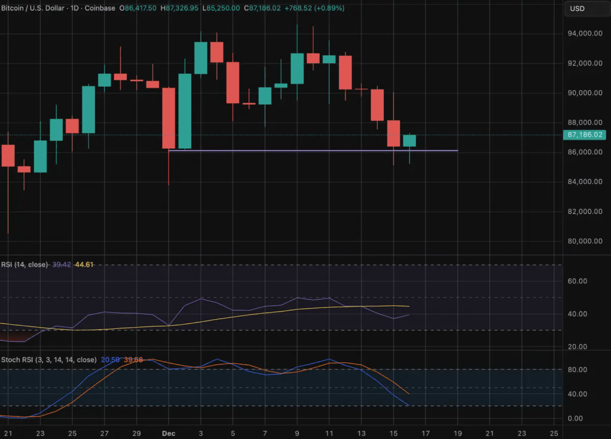 As we approach the end of 2025, the crypto market stands at a critical juncture. Many traders and analysts were in high hopes of a so-called “Santa rally”, a seasonal narrative that has historically led to cryptocurrencies going higher in the Q4. This, however, seems to be fading. The reality is that Bitcoin (BTC) is down nearly 32% from its all time highs set in October and has now broken a technically key zone of $86,000 (albeit with a bounce to the $87K at the time of this writing, trading as low as $85,100 on December 15, 2025.