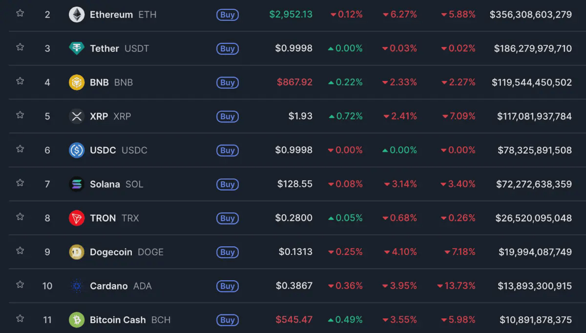 The top ten alts are down by an average of 2.65% over the last 24 hours with Ethereum, Solana and Dogecoin experiencing that sharpest drawdowns