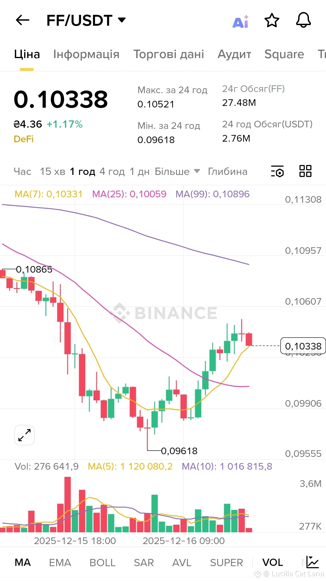 Подивіться на поточний графік $FF — ціна 0.10338 USDT, зростання на 1.17% за добу. За останні 24 години максимум був 0.10521, мінімум 0.09618 — це коливання на 9.4%. І ось у чому краса поєднання криптовалют з RWA: коли $FF падає на 10%, а у вас частина застави — це токенізована нерухомість або золото, загальний профіль ризику вашого портфеля стає набагато стабільнішим. Це диверсифікація не просто між токенами, а між цілими класами активів.