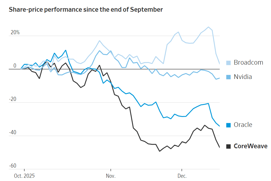 When CoreWeave’s plan to buy Core Scientific for $9 billion fell through at the end of October, investor trust dropped even more. Core Scientific (CORZ), a former Bitcoin miner that now rents out data centers, turned down the deal after shareholders warned that it would put them at risk of CoreWeave’s volatile share price and over-leveraged balance sheet.
