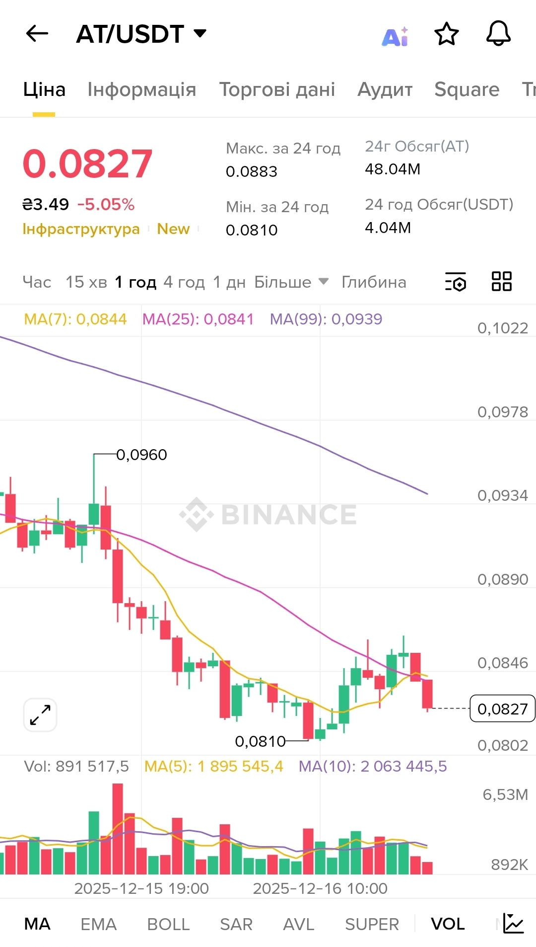 $AT loses -5.05% for the day, price 0.0827, and I look at this chart with the feeling of someone trying to assemble a puzzle with missing pieces. The range 0.0810-0.0883 is almost 9% of the span, and we closed practically at the daily minimum. Volume 48 million AT with a turnover of only 4 million USDT. Many tokens change hands for small amounts of money, and this ratio tells a story of a lack of conviction.