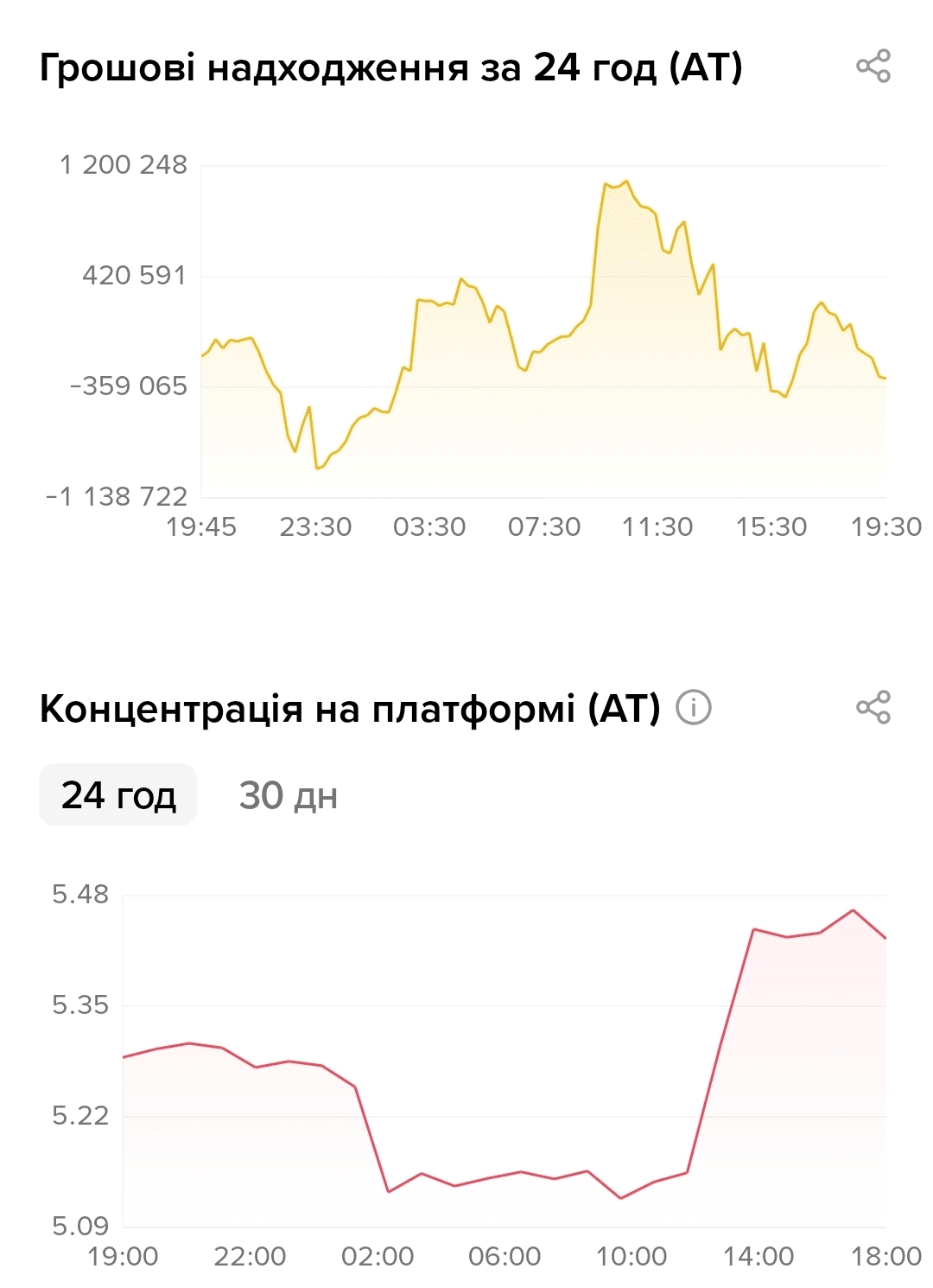 The volume histogram below shows periodic spikes of activity up to 6 million AT per hour, but between them - long periods of meager volumes. Average moving volumes at levels of 1.9-2 million show basic liquidity, but it is not increasing. There is no influx of new participants. There is no growing interest. There is a stable base of those who hold or trade in a narrow range.